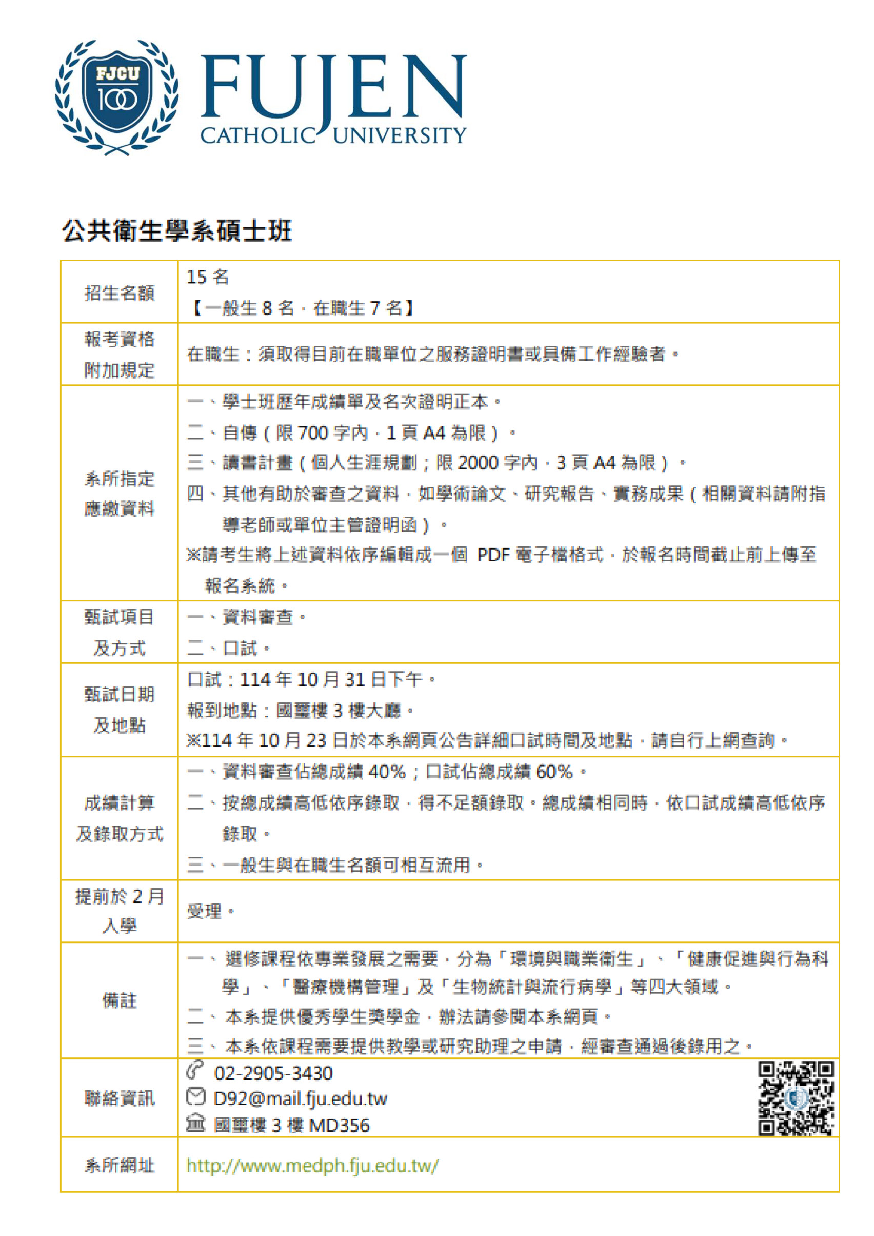 天主教輔仁大學115學年度博士班暨碩士班甄試